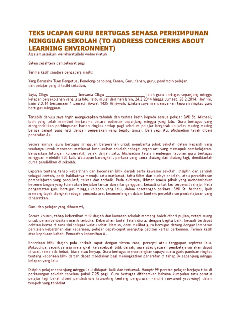 Teks ucapan guru bertugas semasa perhimpunan mingguan sekolah (to address concerns about learning environment) assalamualaikum warahmatullahi wabarakatuh.