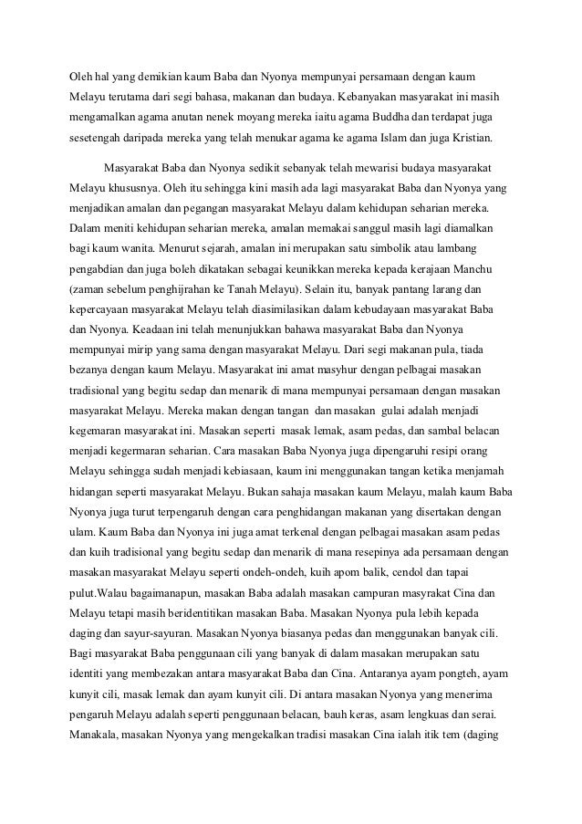 Ini menunjukkan bahawa masyarakat baba dan nyonya mempunyai mirip yang sama dengan masyarakat melayu. This could mean chinese, indian, arabic, eurasian & dutch mixed with locals that maintains a very very specific peranakan culture. ibu yang hamil tidak boleh. Ketika sekolah rendah, kita telah diajar mengenai masyarakat baba dan nyonya. Secara ringkasnya, baba dan nyonya adalah masyarakat kaum cina yang mengamalkan budaya melayu sama ada secara penuh ataupun separuh.