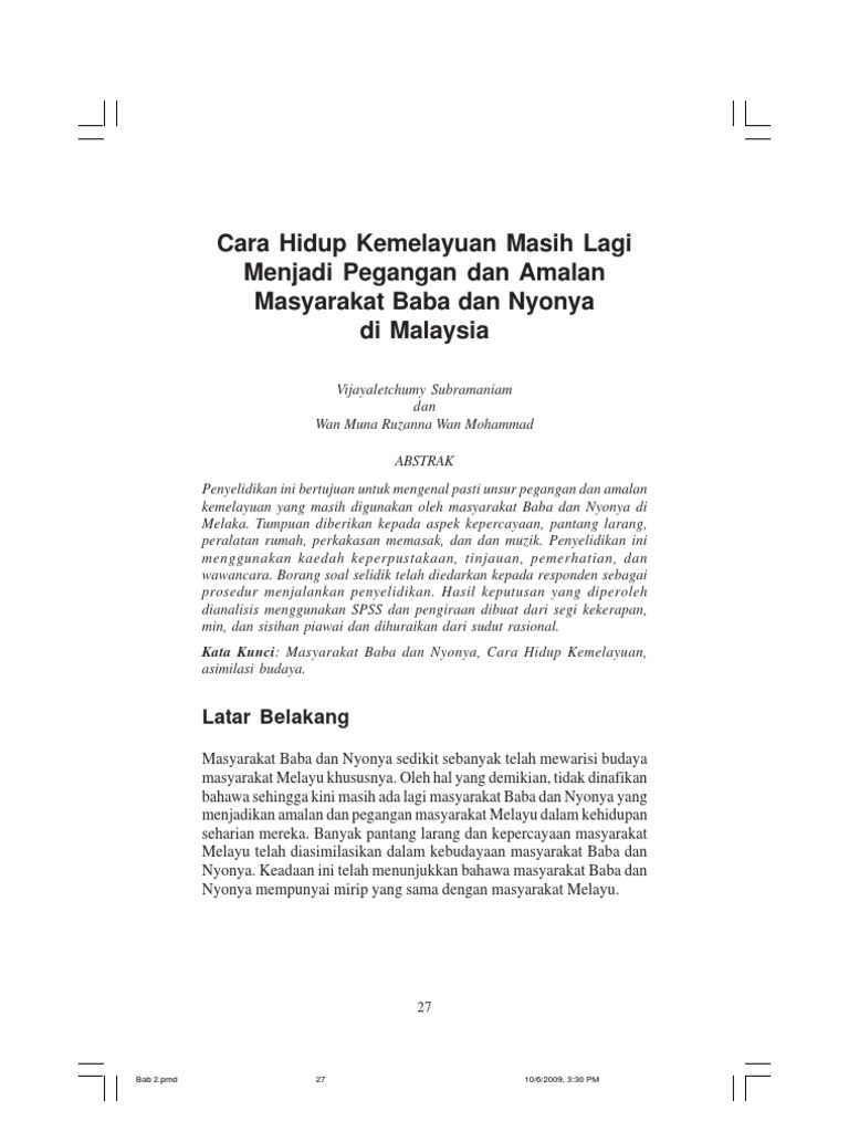 Makanan tradisi masyarakat baba ini biasanya. Ambil sedikit daun, ikat pantang larang demam campak bayi. Mama tidak terlalu ketat untuk urusan sekolah, dari dulu kalau aku bolospun mama tidak marah dan melarang, karena tahu nilai raportku selalu baik, jadi mama tidak terlalu khawatir. Masyarakat baba nyonya di melaka fasih bertutur bahasa melayu dan mengikut fakta sejarah golongan ini mempunyai pertalian dengan di samping itu, jurnal ini juga turut mamaparkan data berkenaan dengan asimilasi dalam kepercayaan dan pantang larang masyarakat baba dan nyonya. Kampung tujuh, melaka yang menempatkan komuniti chitty.